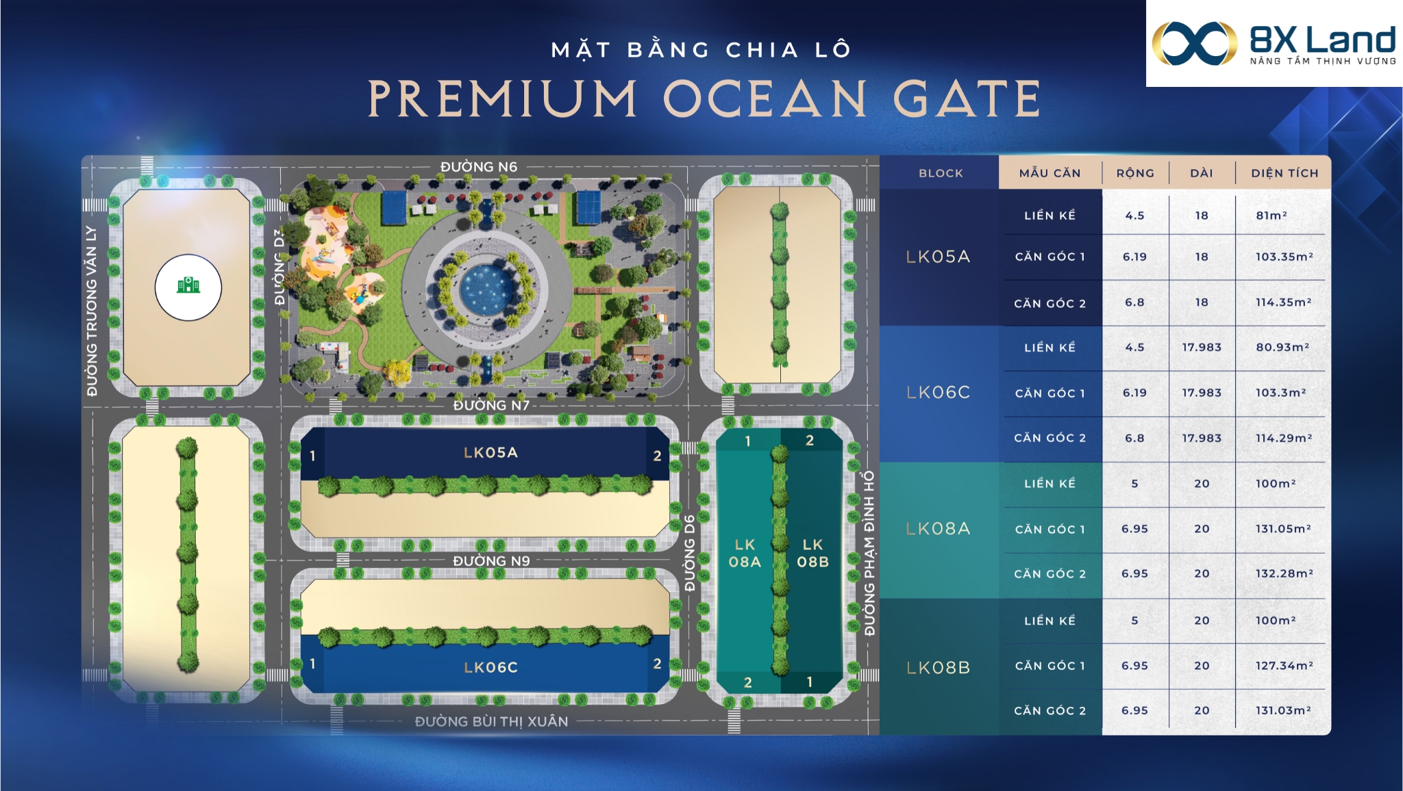 Chào đón một phong cách sống thượng lưu tại Premium Ocean Gate - nơi biển cả hòa quyện cùng kiến trúc hiện đại. Mặt bằng phân lô được thiết kế tinh tế, mở ra không gian sống lý tưởng với đa dạng lựa chọn: từ những biệt thự biển sang trọng đến những cửa hàng thương mại sầm uất. Hạ tầng đồng bộ, pháp lý rõ ràng và tiềm năng tăng trưởng vượt trội, từng lô đất được quy hoạch tỉ mỉ, hạ tầng hoàn thiện và pháp lý minh bạch, đảm bảo tiềm năng sinh lời vượt trội và bền vững cho những nhà đầu tư tiên phong.