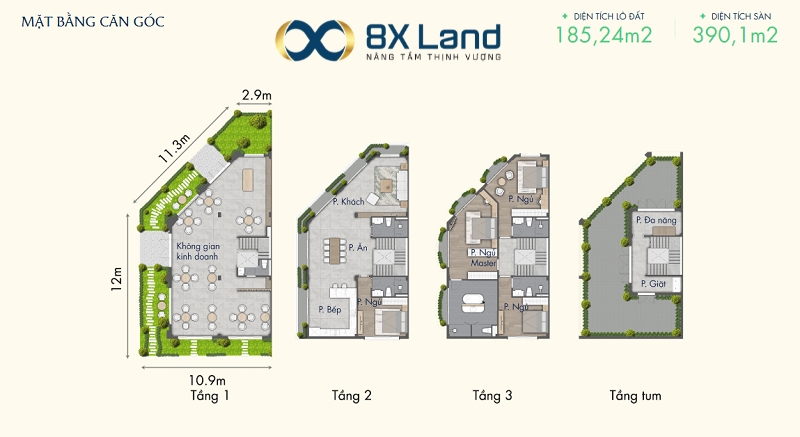 Đây là mặt bằng căn góc của phân khu Hải Đăng thuộc dự án Cà Ná New City. Căn có diện tích lô đất 185,24m² và diện tích sàn 390,1m², bao gồm 4 tầng: